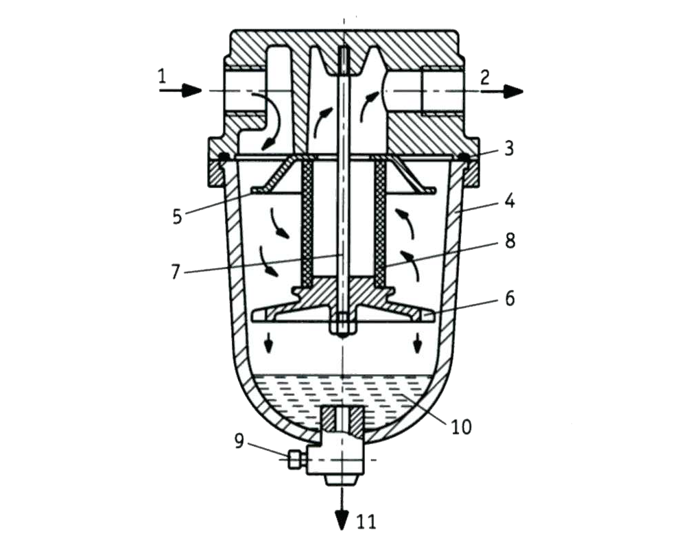 (1 - вход воздуха, 2 - выход воздуха, 3 - уплотнительное кольцо, 4 - контейнер (стакан), 5 - направляющие лопасти, 6 – сепаратор, 7 - монтажный винт, 8 – фильтроэлемент, 9 - кнопка для ручного отвода конденсата, 10 – конденсат, 11 - отвод конденсата)
