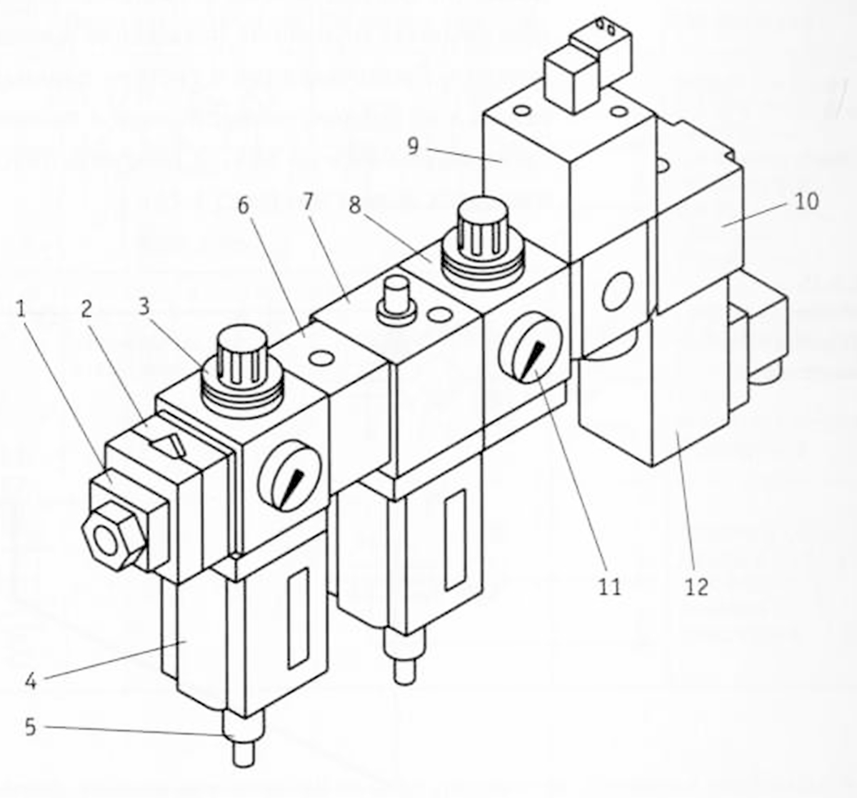 Блок подготовки воздуха представляет собой комбинацию устройств, расположенную в точке отбора сжатого воздуха из сети. Он позволяет очищать сжатый воздух и обычно состоит из отсечного клапана, фильтра, регулятора давления и маслораспылителя. Элементы могут располагаться в указанном порядке, и при их монтаже следует обращать внимание на направление потока, которое указывается снаружи стрелкой. В блок подготовки могут встраиваться элементы безопасности и контроля. На на рис.1 представлен пример основных элементов блока подготовки воздуха.