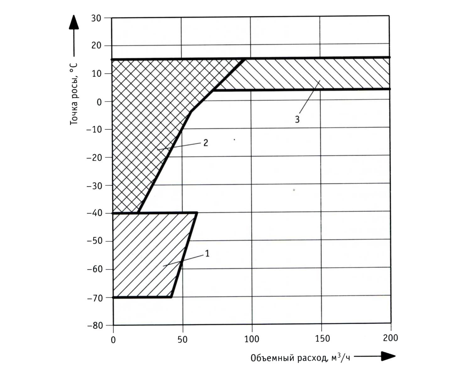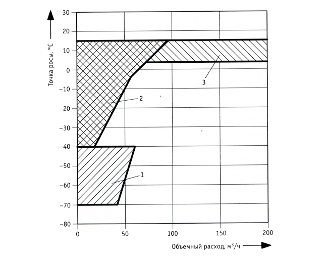 Области применения различных типов осушителей представлены на рис. 2 (1 – адсорбционный осушитель, 2 – мембранный осушитель, 3 – рефрижераторный осушитель с расходом до 1000 м3/час).