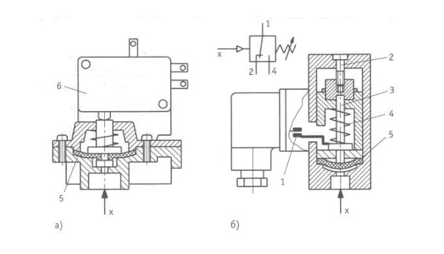 (1 - Контакт, 2 - Винт настройки, 3 - Толкатель, 4 - Пружина сжатия, 5 - Мембрана, 6 - Микропереключатель, Х - вход давления)